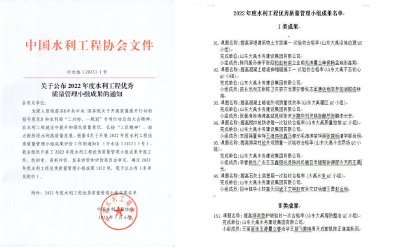 克日,中国水利工程协会宣布了“2022年度水利工程优质质量治理小组”效果名单,集团公司申报的7项效果上榜,其中Ⅰ类效果6项、Ⅱ类效果1项。