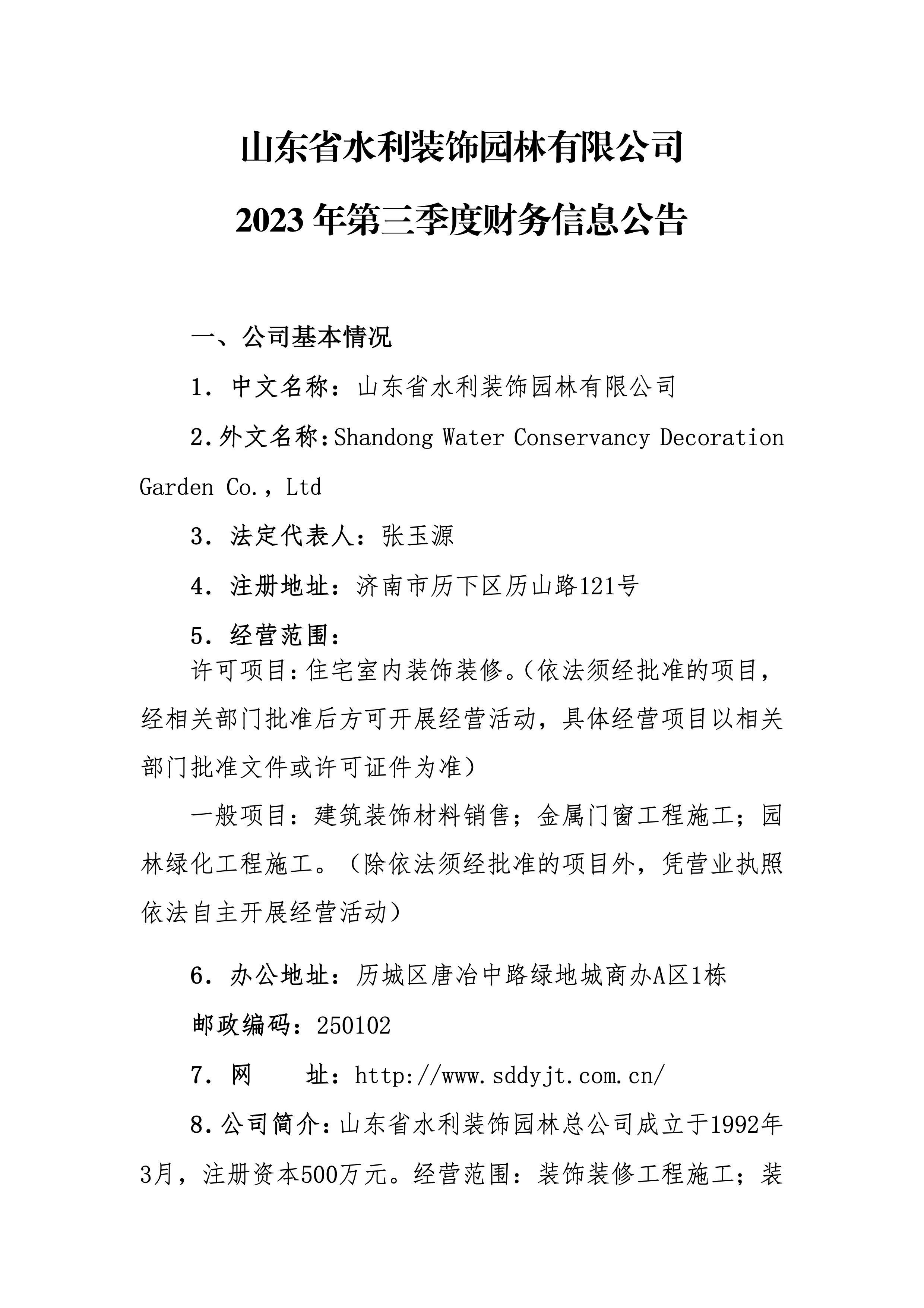 山东省水利装饰园林有限公司2023年第三季度财务信息通告