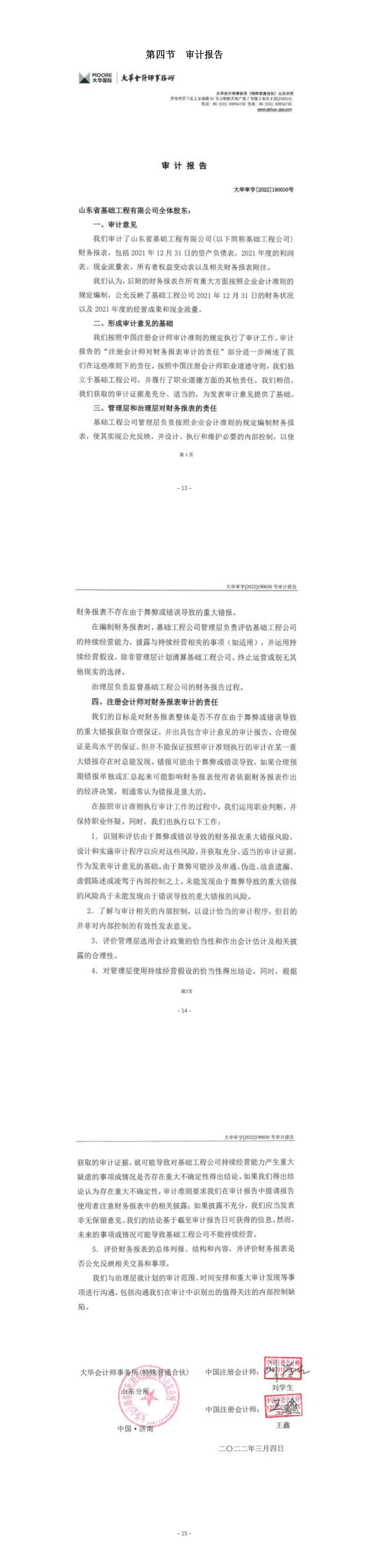 .山东省基础工程有限公司2021年度财务重大信息通告